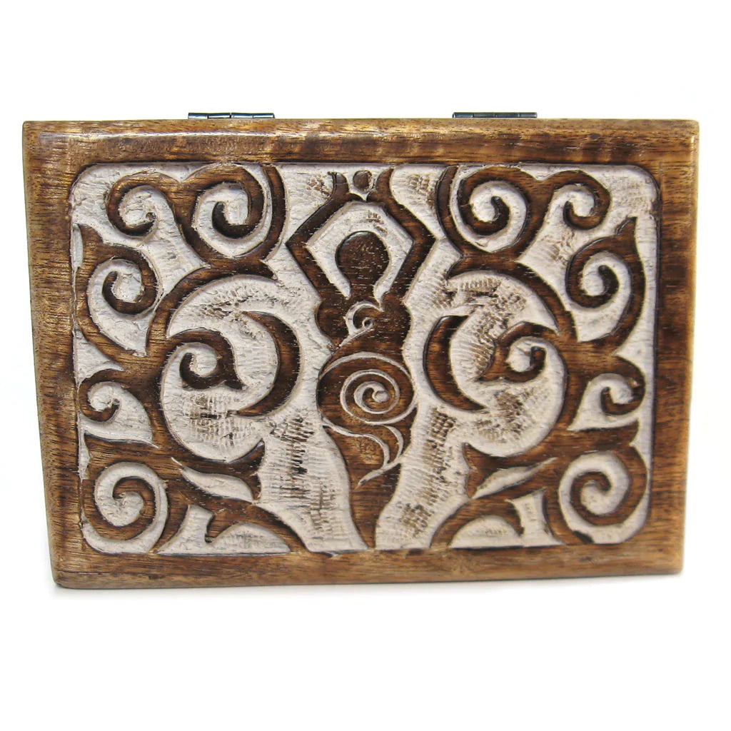 A Goddess image surrounded by spirals represents creativity, divine energy, and rebirth. It's the perfect place to store your mystical tools and treasures.