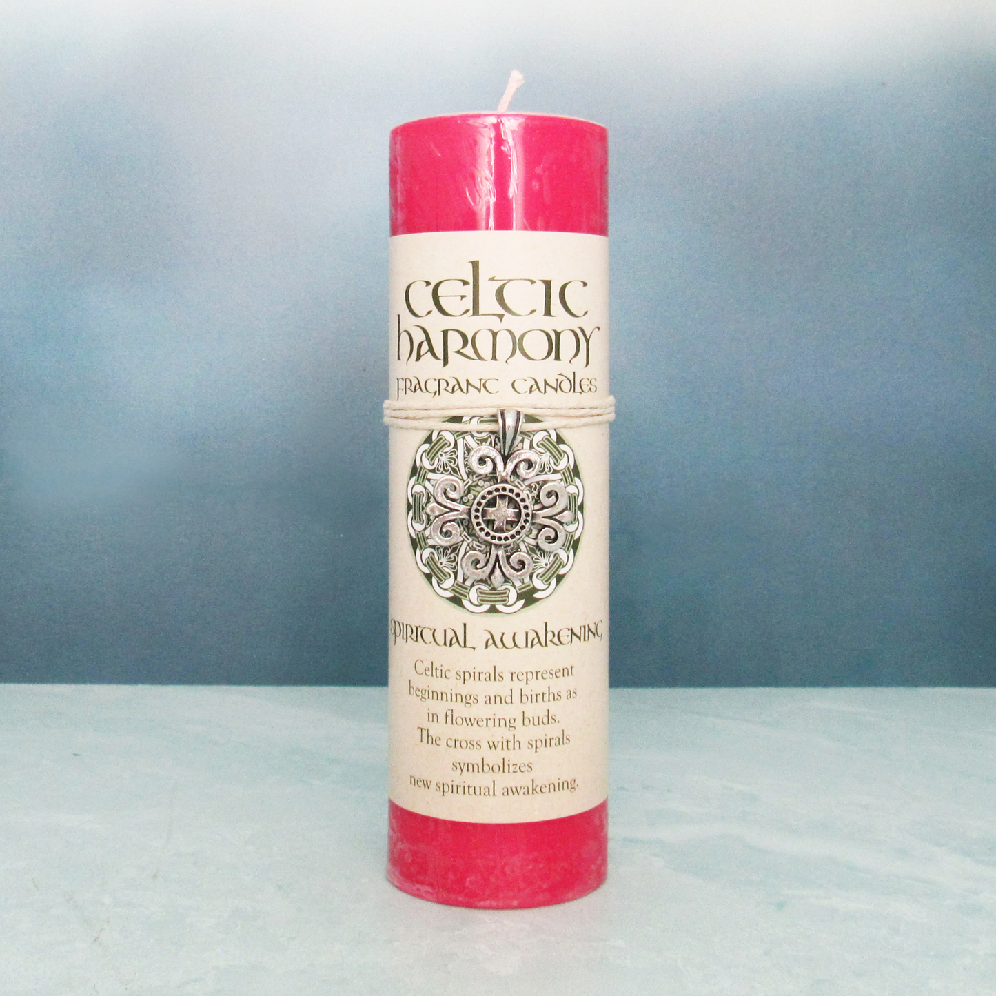 A scented pillar candle with a pewter pendant representing Spiritual Awakening. Celtic Harmony candles are made in the United States from pure paraffin wax and quality fragrance oils. Each comes with a pendant, making them ideal for collecting or gift-giving.
