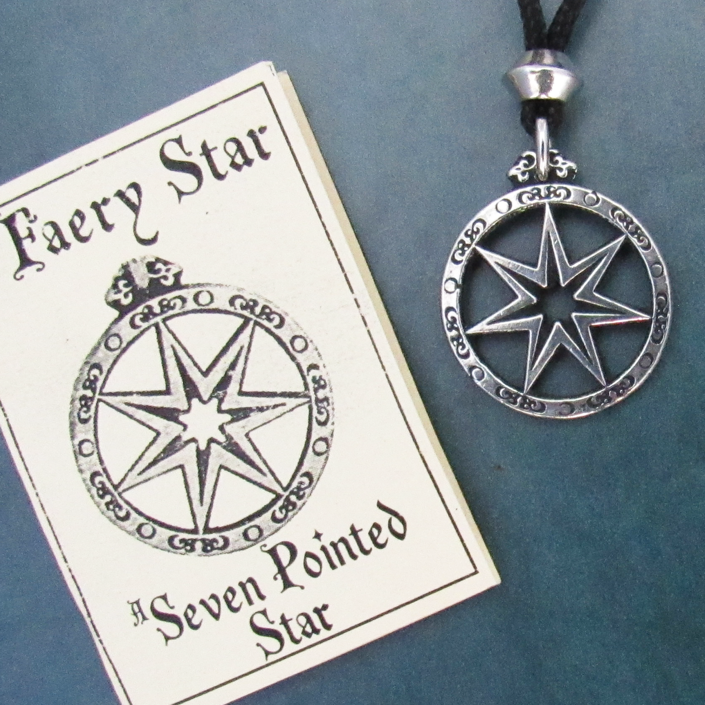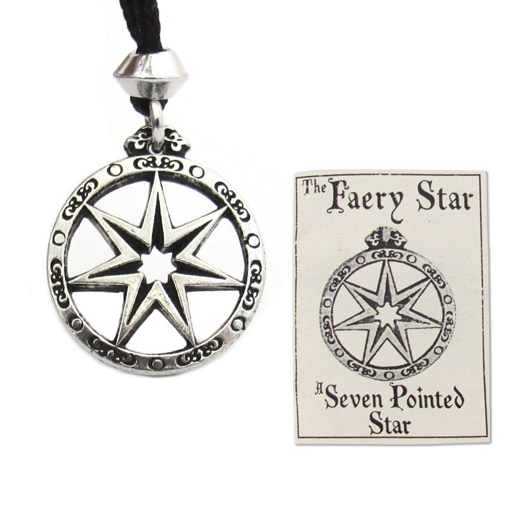 This double-sided pewter talisman is cast in the shape of a seven-pointed Faery Star. The seven points represent the Sun, the Forest, the Sea, Magick, the Moon, the Wind, and Spirit. The pendant comes with a 34-inch woven cord, pewter bead, and booklet.