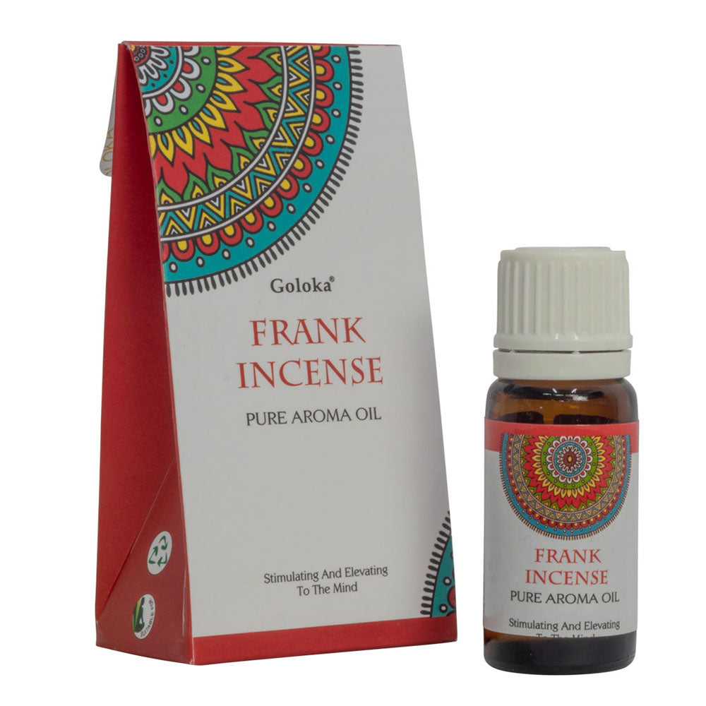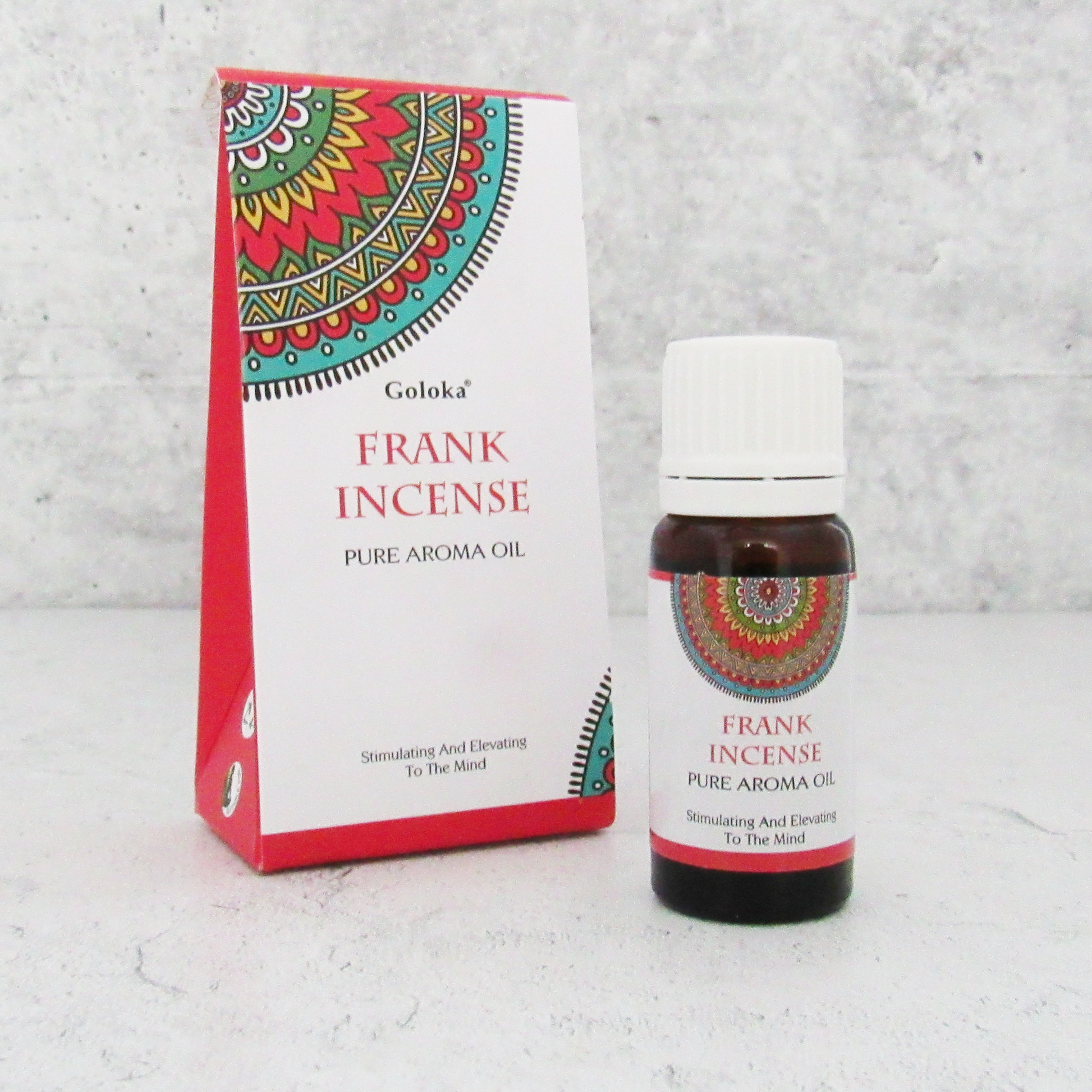 Enjoy the rich and uplifting scent of Frankincense in this concentrated aroma oil from Goloka.. 10 ml (approximately 1/3 oz) aroma oil in an amber glass bottle.