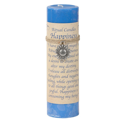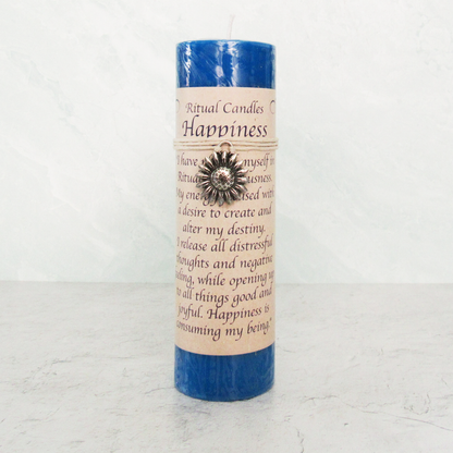Instructions: Prepare an altar space or flat surface for your candle burning ritual. You may include herbs, art/photos, or other objects that remind you of your intention to attract and embody Happiness. Breathe in the scent of the candle and focus on the object of your desire. When you're ready, light the candle and release your will into the universe. Keep or wear the pewter amulet as a charm to extend your blessings and serve as a reminder of your work.