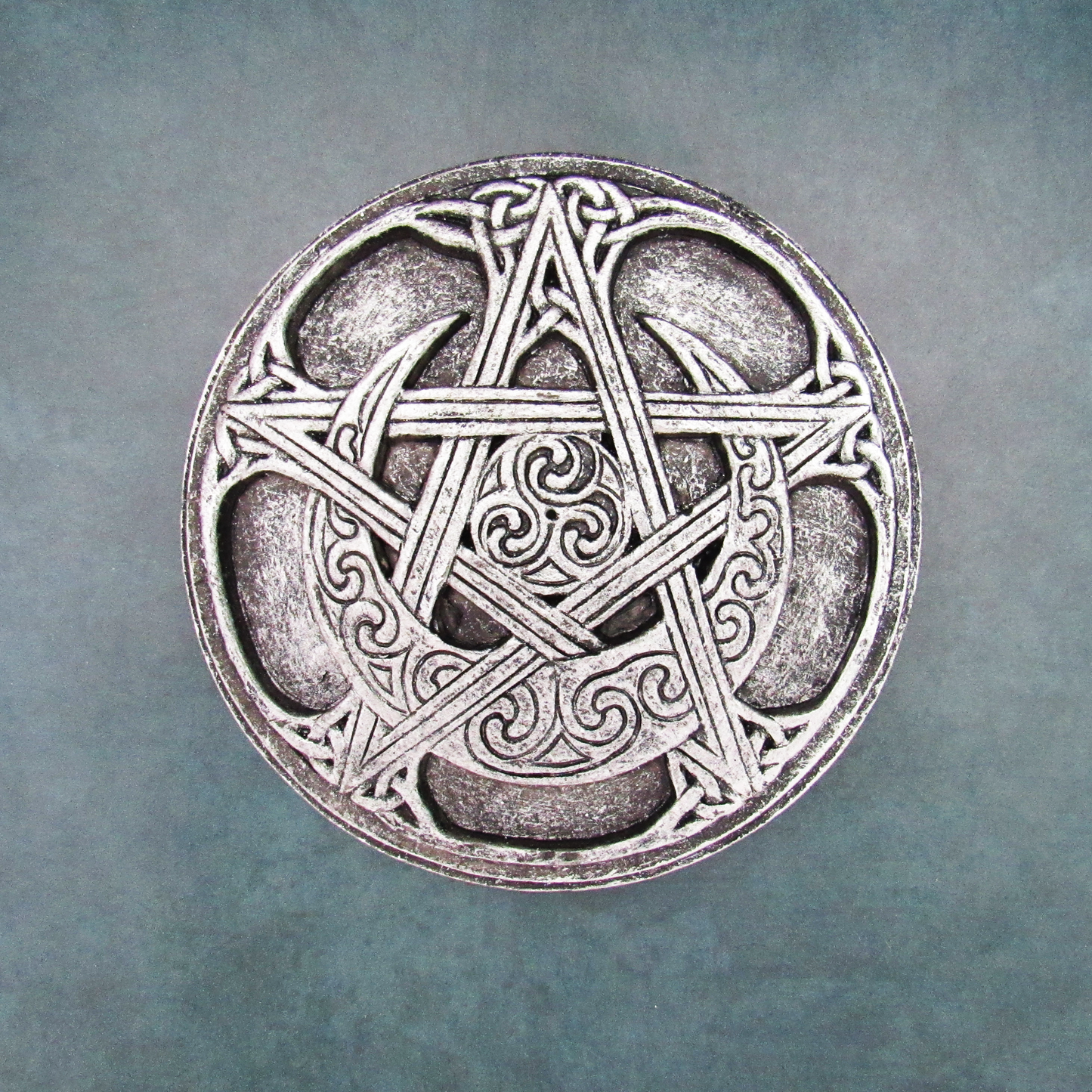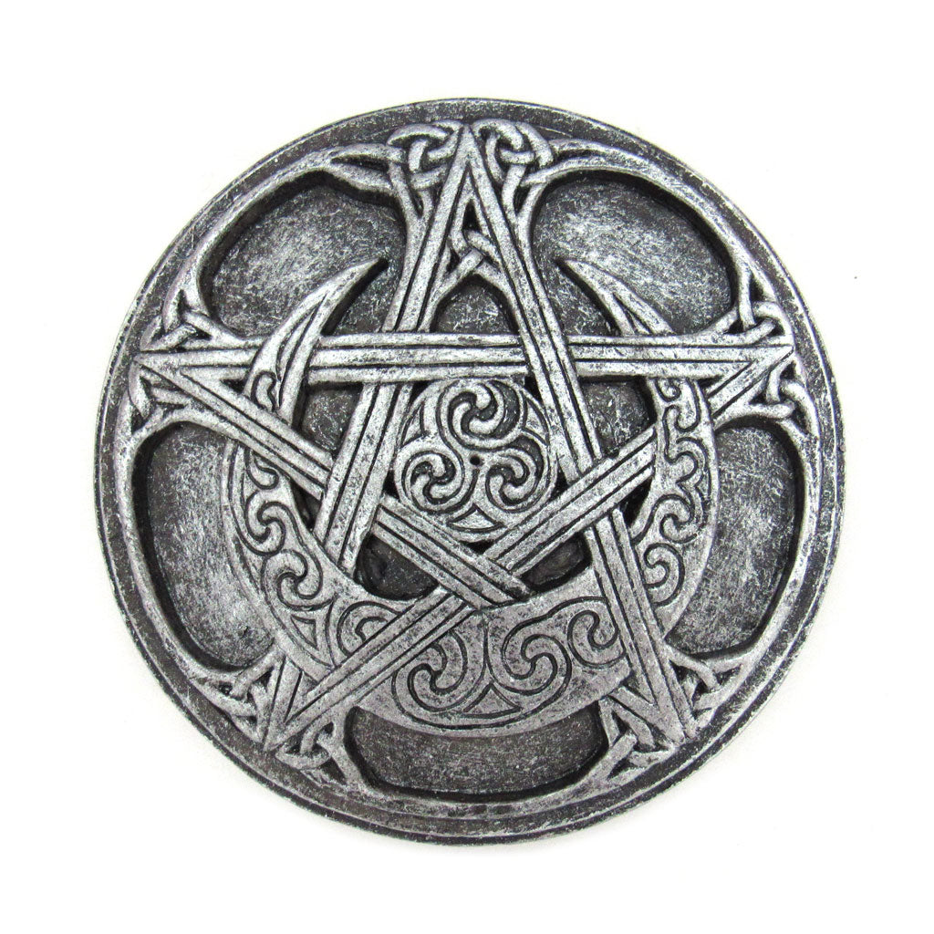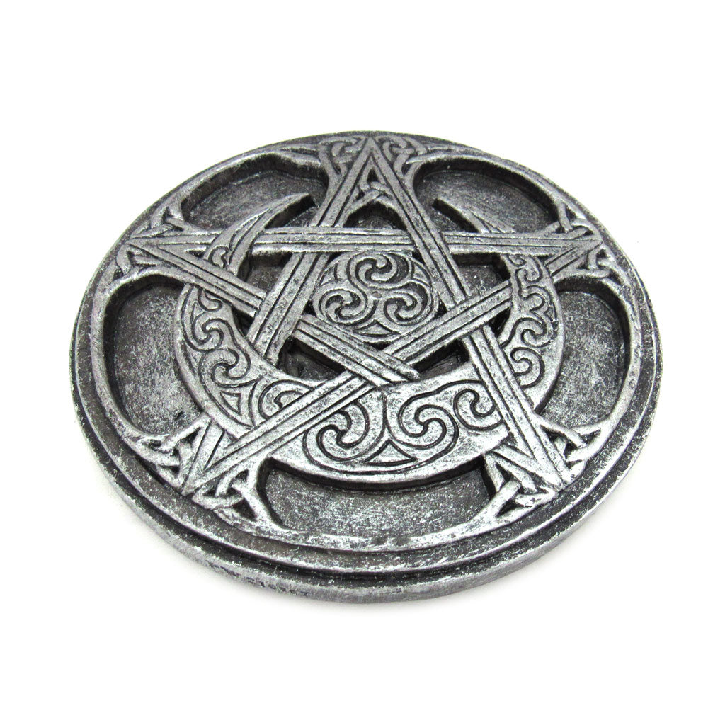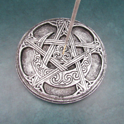 A detailed incense burner with a pentagram and crescent design. A hole in the center holds thin incense sticks, or it can be used to burn cone incense.