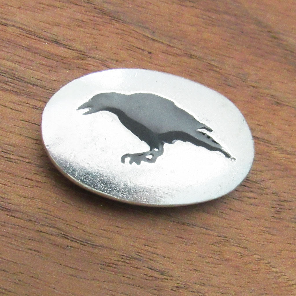 The Raven design is set within an oval of pewter and finished with black enamel. Carry it for luck and inspiration!