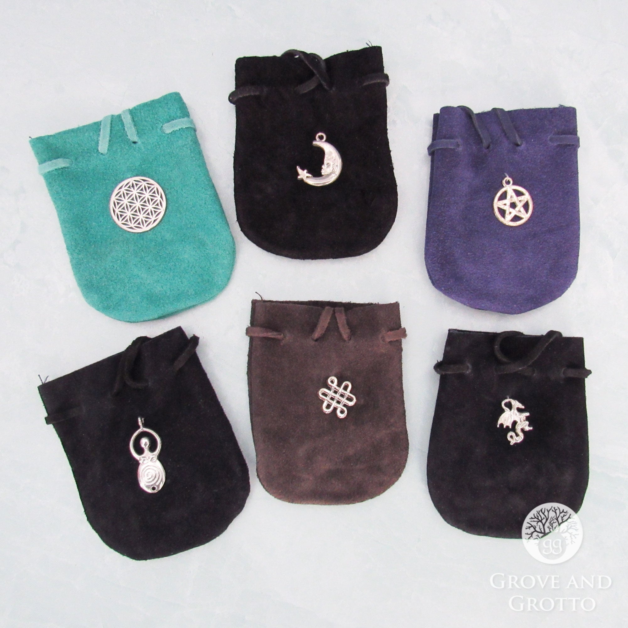 A black suede bag with a long drawstring cord, perfect for holding your sacred treasures, stones, or small gifts. It's decorated with a silvertone Dragon charm.