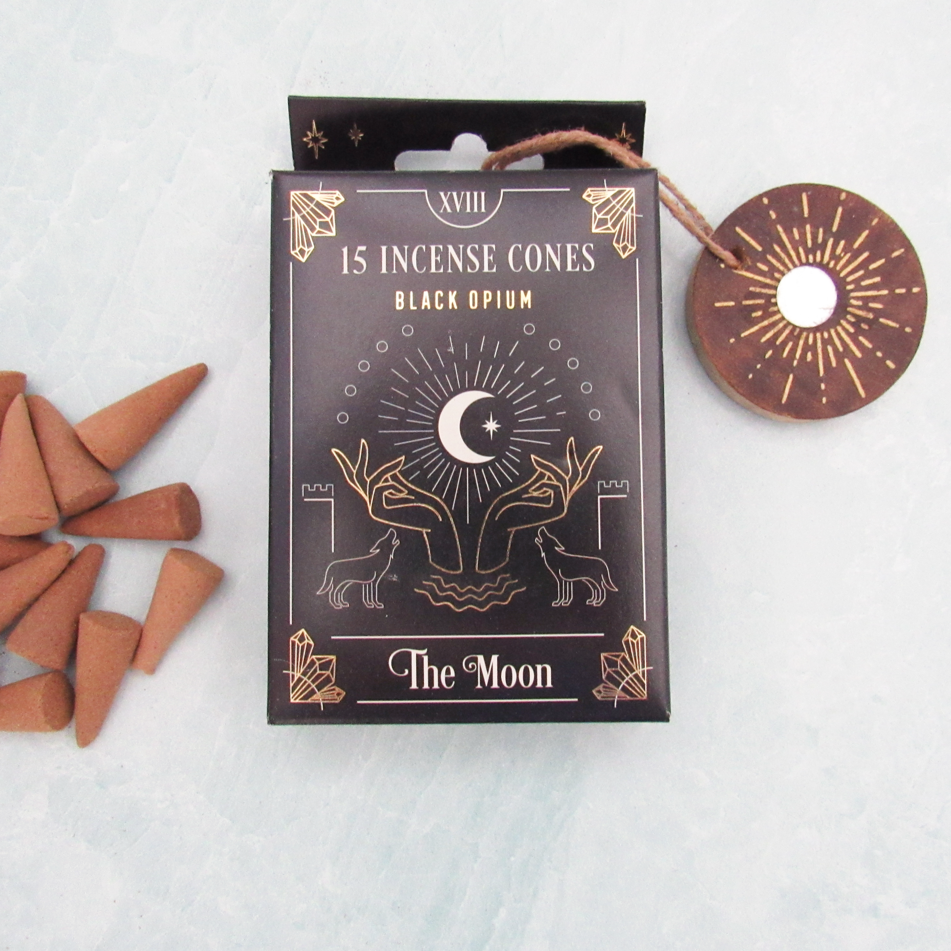 This sultry and mysterious Black Opium incense is inspired by The Moon card. Box includes 15 incense cones and a hand-painted wooden ornament that can double as an incense holder.