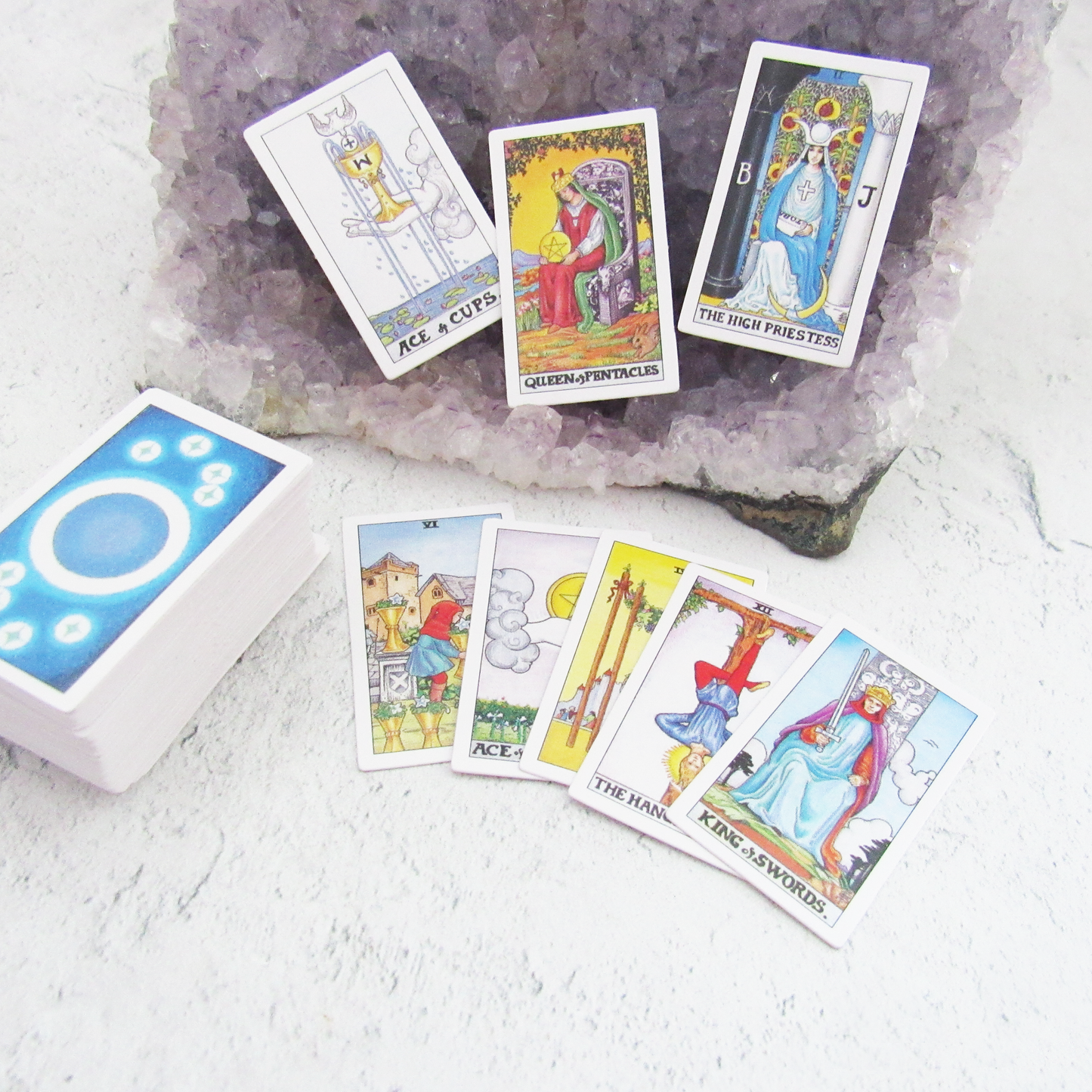 At less than one and a half inches tall, this precious tarot deck can go anywhere with you. This miniature deck comes with its own tiny instruction booklet. Tiny Universal Waite Tarot features the iconic drawings of Pamela Colman Smith, expertly re-colored by Mary Hanson-Roberts. The original meanings and rich symbolism of the Rider-Waite artwork come though with greater clarity and fresh, new details.