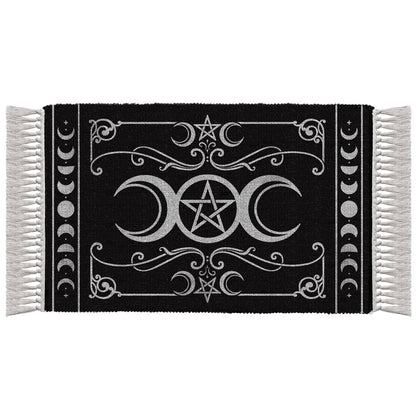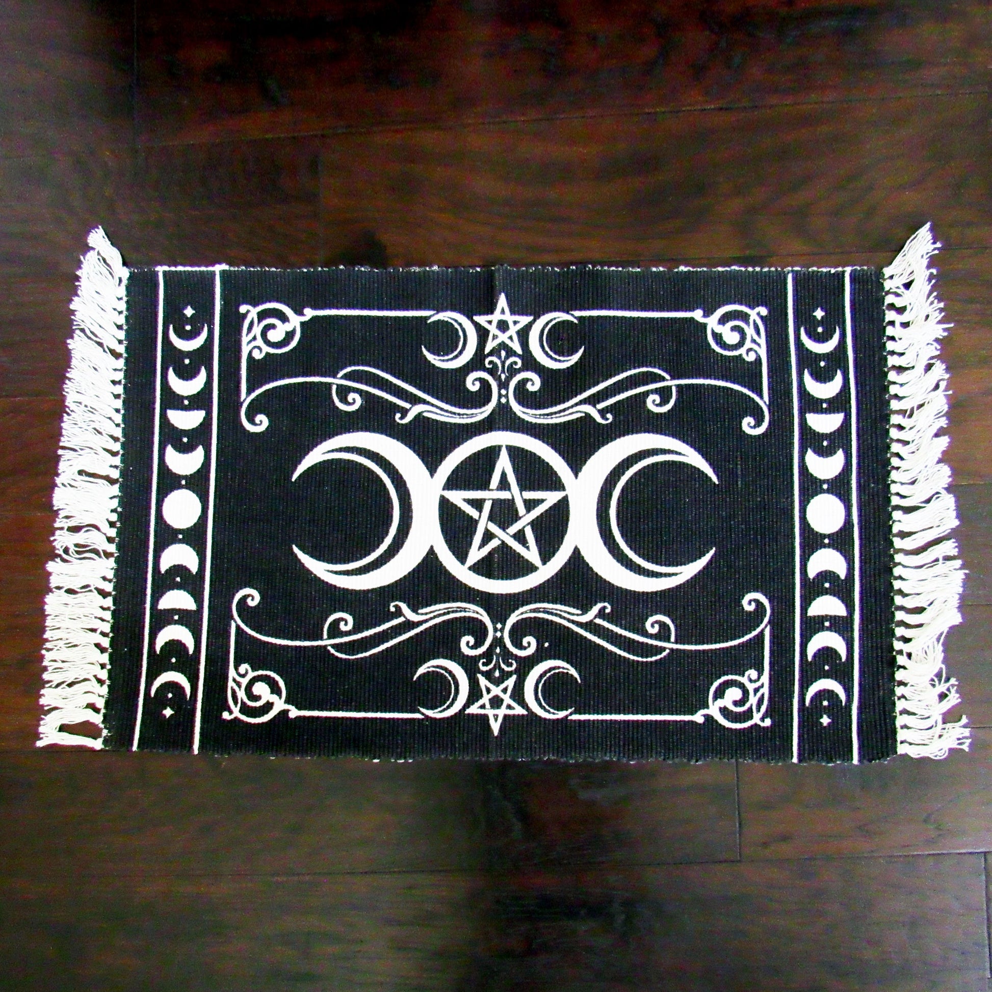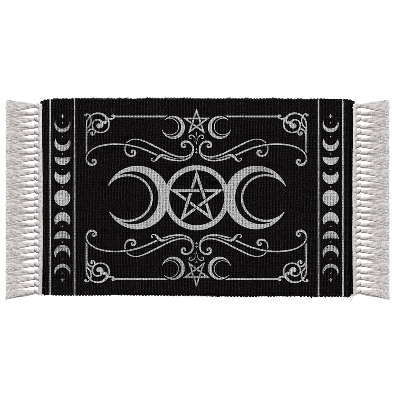 Maiden, mother and crone symbolised as the lunar goddess waxing and waning through the tides of time, as the enigma of the elemental pentacle beckons you to practice the craft. An enchanting rug to accessorise your crypt!
