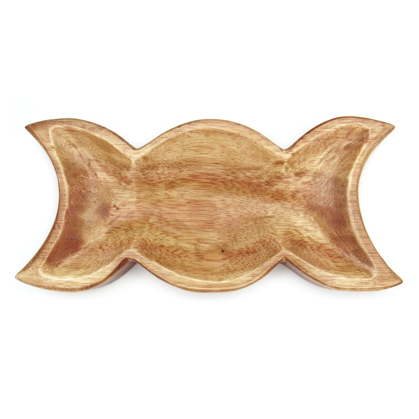 Carved from honey blonde Teak wood, this shallow dish is a graceful addition to your home or altar. The Triple Moon design provides three small compartments for your crystals, jewelry, or trinkets.